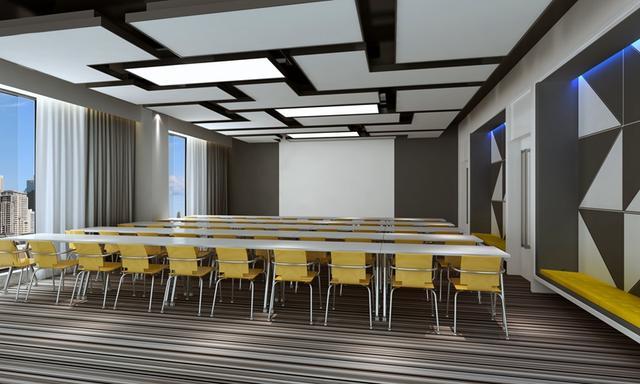 干凈硬朗的員工培訓室設計,符合這個功能區緊張而又嚴肅的工作氛圍。右側設置有休閑區,搭配幾何造型的立面設計,可以達到調節工作節奏的效果。