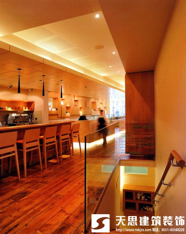 店鋪后部特別定制的玻璃吊燈象征著可可豆的豆莢。其他的設(shè)計元素包括回收的松木地板、石灰石柜臺和臺面、鮮橙色皮革、橡木制品以及長條噴漆天花板。北京餐廳設(shè)計師在處理天花板時,將不同的元素統(tǒng)一在一起,突出了空間的長度并將人們的眼球吸引到店鋪后部。地下室主要是用來展示的廚房,里面設(shè)置著巧克力制作課程和工坊。